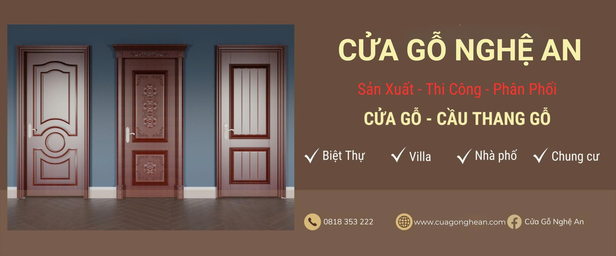 Cửa Gỗ Nghệ An là thương hiệu Cửa với hơn 10 năm chuyên sản xuất, thi công trực tiếp các dòng cửa cao cấp với các loại gỗ tự nhiên tốt nhất trên thị trường hiện nay, bao gồm: Gỗ Hương Đá, gỗ Gõ Đỏ, gỗ Óc Chó, gỗ Lim Nam Phi, gỗ Sồi Nga…