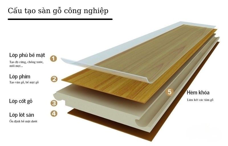Hầu hết sàn gỗ công nghiệp có cấu tạo gồm 4 lớp (tùy theo nhà sản xuất thì cấu trúc này có thể thay đổi) là: lớp đế, lớp cốt HDF, lớp giấy trang trí, lớp bề mặt Oxit nhôm.