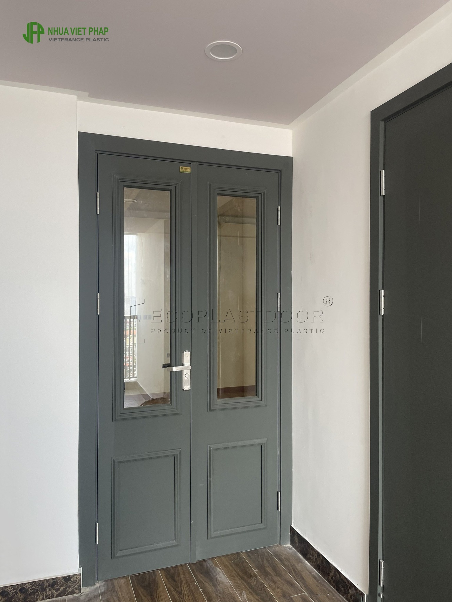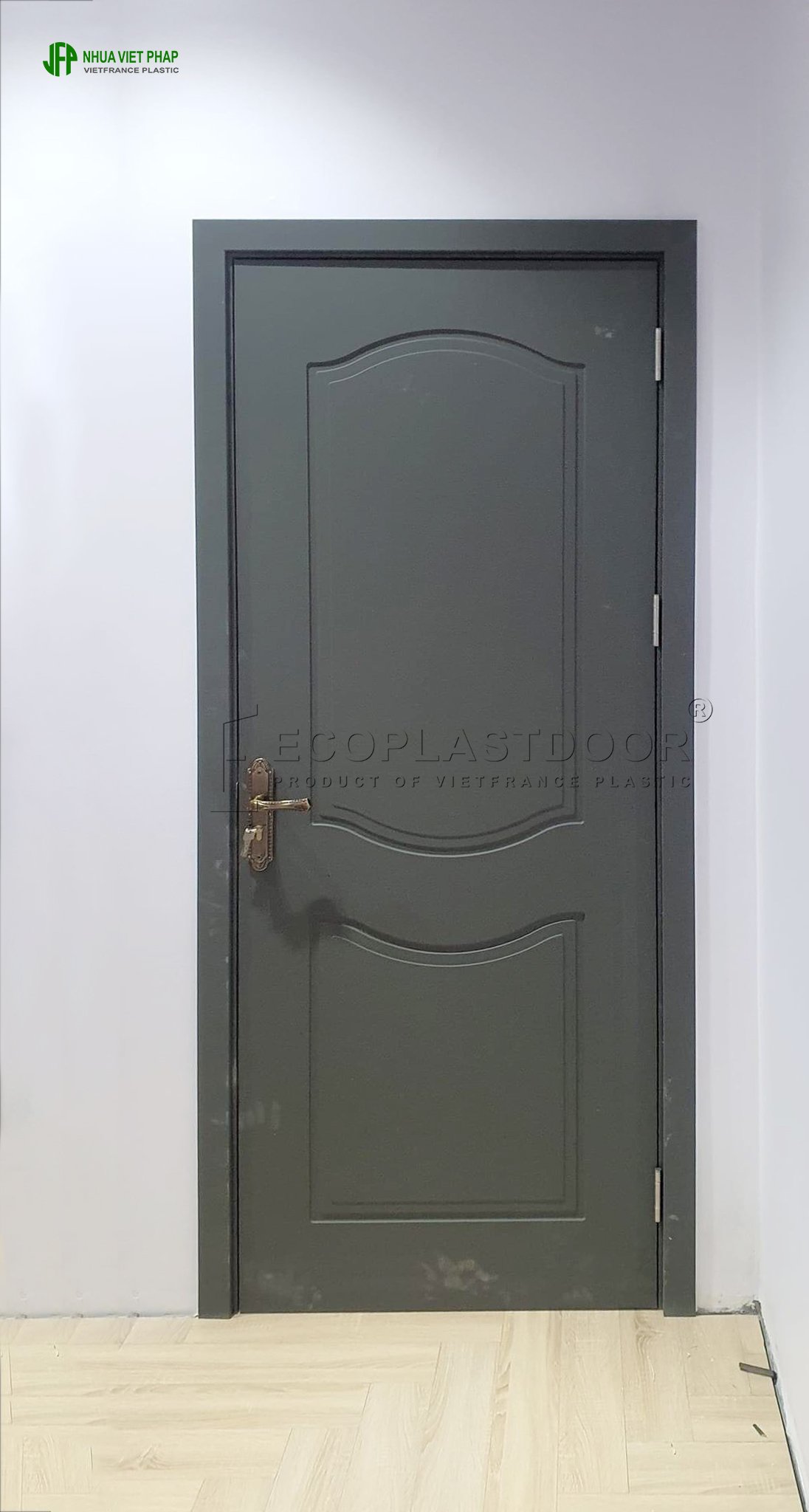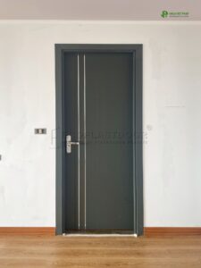 Mẫu FP01 thuộc dòng cửa nhựa–gỗ composite Việt Pháp, thiết kế phẳng hiện đại, chạy chỉ âm CNC tối giản, phù hợp phong cách nội thất trẻ trung.