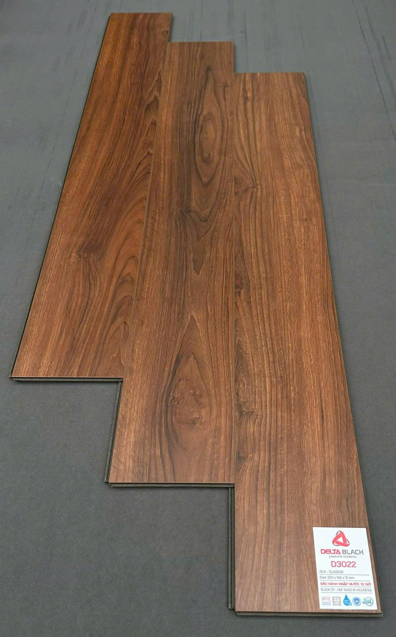 Sàn gỗ Deltablack D3022 sử dụng cốt HDF nhập khẩu Indonesia, mật độ cao, khả năng chịu lực tốt.